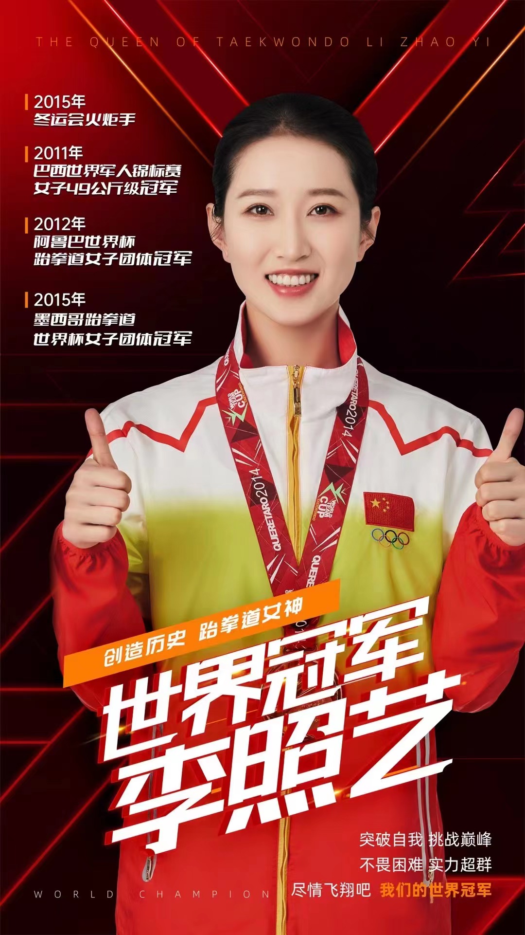 李照藝,女,2012、2015年兩屆跆拳道世界杯冠軍,國(guó)際健將。2012年榮獲國(guó)家體育總局運(yùn)動(dòng)榮譽(yù)獎(jiǎng)?wù)拢?013年榮獲“三八”紅旗手榮譽(yù)稱號(hào)。優(yōu)秀共產(chǎn)黨員,榮立過(guò)2次二等功。2015年冬運(yùn)會(huì)火炬手。
